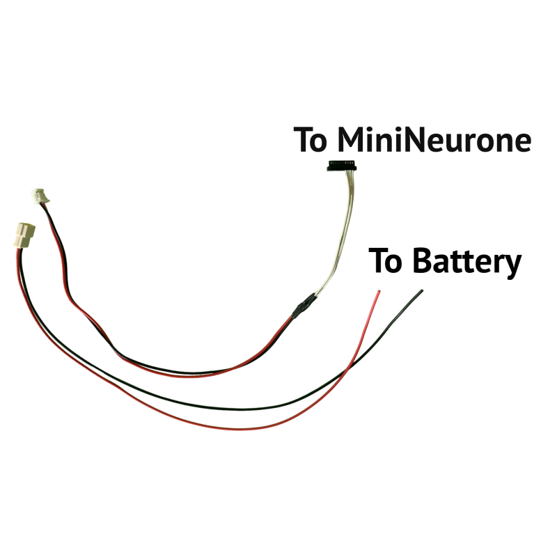 This cable connects the MiniNeurone to a battery via JST ZHR-2 and JST-ZMR-2 connectors. The battery can be disconnected by separating the JST connectors.